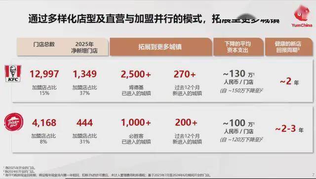 2025 年肯德基的新开门店平均本钱收入曾经从 2024 年的 150 万元下降至约 130 万元,必胜客则由 120 万元下降至约 100 万元。近两年新推出的多个低成本门店模子曾经成为百胜中国拓展低线城市的从力:单店投资 50 万-70 万的肯德基小镇模式;65-85 万的必胜客 WOW;比来正正在试点的 70-80 万元的肯德基必胜客 “双子星” 模式。这些低投入的门店模子,次要针对加盟营业,能够帮帮百胜中国正在偏僻地域,计谋点位以及低线城市敏捷攻城略地。